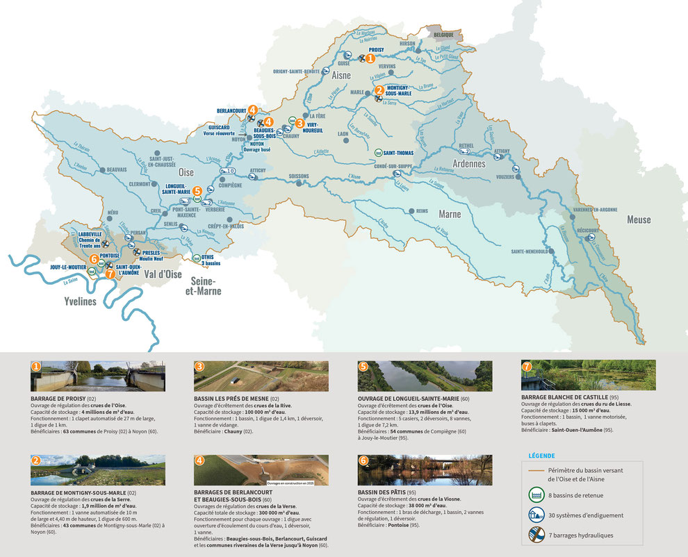 Que ce soit par transfert, par convention ou en tant que propriétaire, l'Entente gère 47 ouvrages, répartis sur le bassin versant de l’Oise et de l’Aisne pour réduire le risque d'inondation :