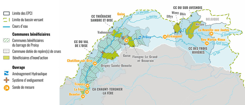 L'Entente conduit des actions déclinées par territoires en fonction des compétences transférées. Il s'agit d'actions qui répondent à des problématiques locales comme la création d'ouvrages de protection contre les débordements de cours d'eau, les aménagements de gestion du ruissellement (coulées de boue), l'aide aux travaux sur les bâtiments pour limiter les dommages d'inondations (Inond'action), etc.